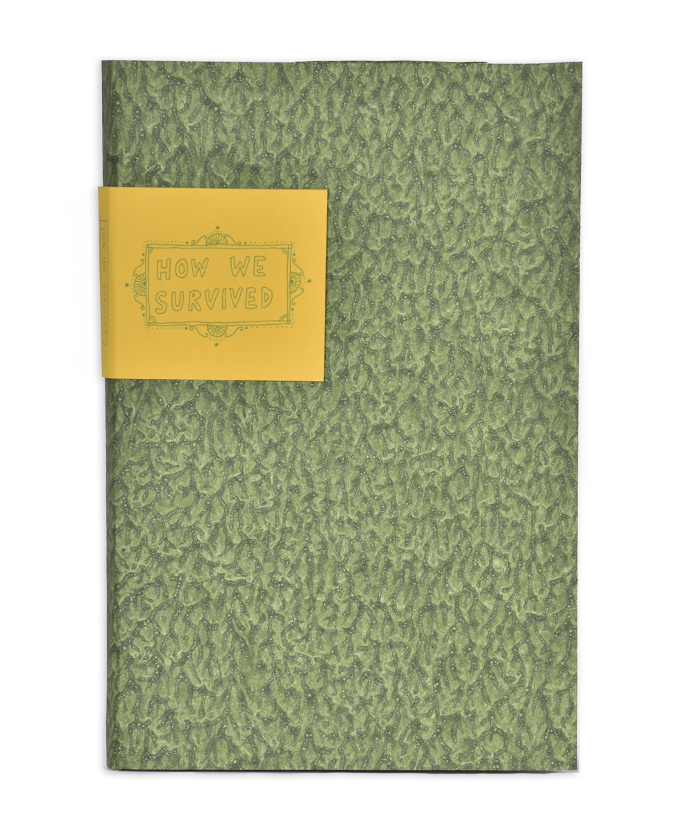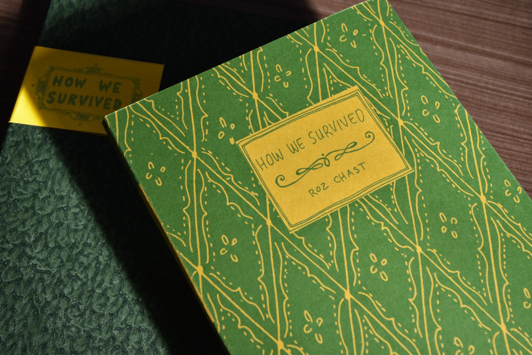 “How We Survived” was published in July 2021 in an edition of 500 Classic Edition copies bound in letterpress printed paper wrappers; 150 Patrons’ Edition copies bound in handmade paste papers and individually numbered and signed by the publisher and Roz Chast; and 24 half-leather copies bound in Moroccan leather with handmade paste paper boards, each individually numbered and signed by the publisher and Roz Chast.