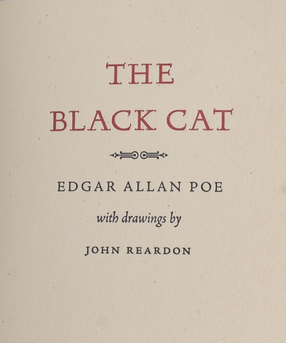 “The Black Cat” was published in May 2020 in an edition of 300 Classic Edition copies on cream paper; 75 Patrons’ Edition copies on milkweed paper, individually numbered and signed by the publisher and artist; and 12 half-leather copies printed on pearl white paper and bound in half-Morocco and handmade paste papers, individually numbered and signed by the publisher and artist. It was included in the Thornwillow Dispatch in June 2020 in response to popular demand during the pre-publication subscription period for EDGAR ALLAN POE: TALES, MYSTERIES & CONTRIVANCES.