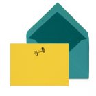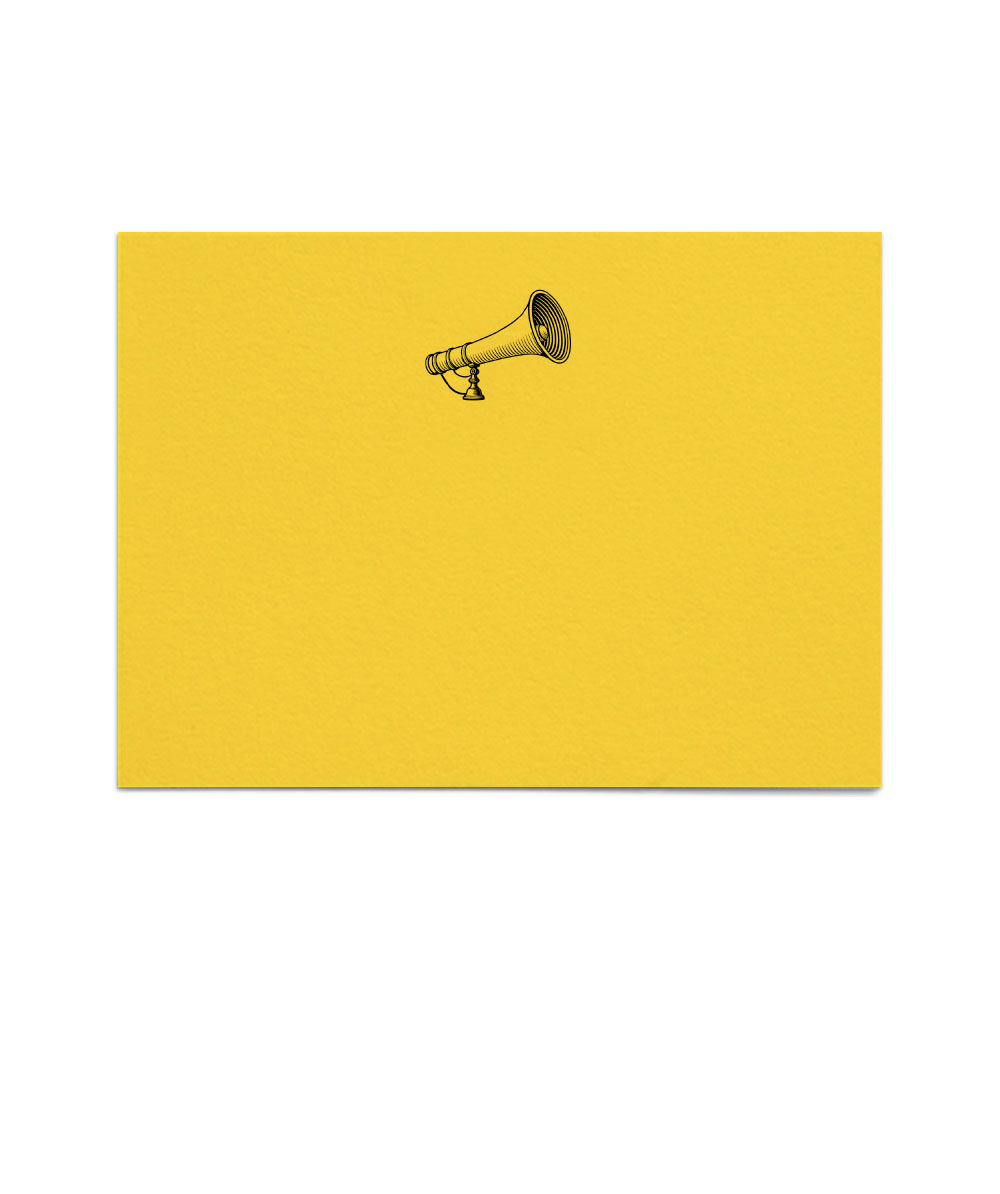 With its vibrant colors and bold design, this Bull Horn Motif makes a spirited statement, infusing your correspondence with energy and style. The design is letterpress printed in Black ink on heavy archival yellow stock, accompanied by teal envelopes.