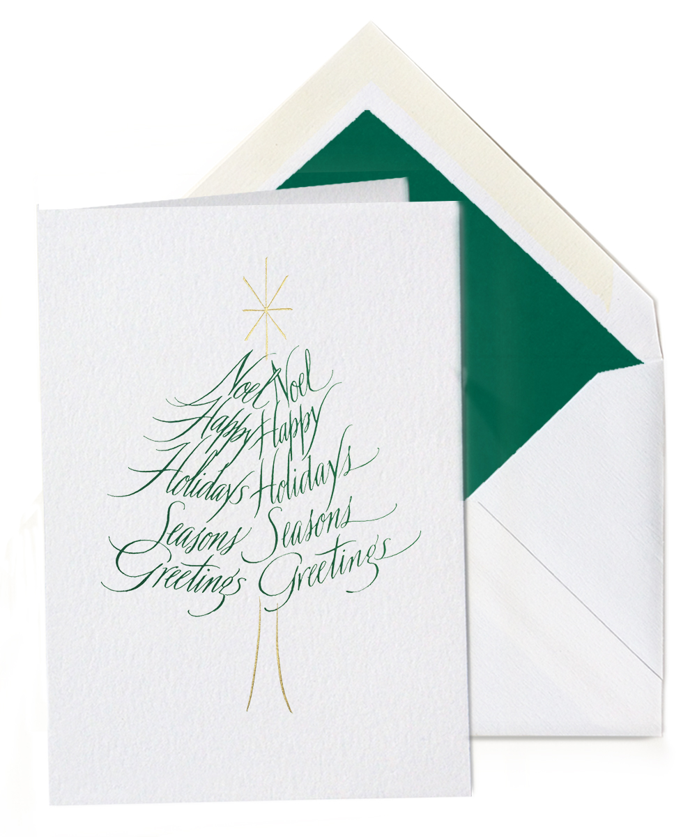 Perfectly elegant, the colonial Calligraphic Tree Card is a beautiful way to send a special holiday greeting, from our Holiday collection. The design is hand-engraved in steel and stamped in gold and holiday green ink on heavy archival stock, the envelopes are lined in evergreen tissue.