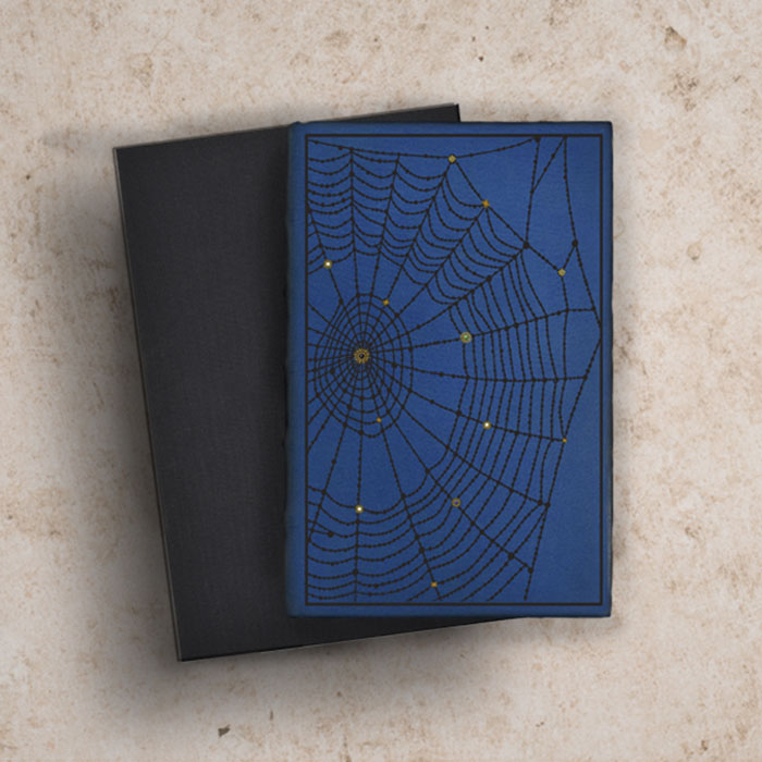 Charlotte’s magnum opus, her great work, was her progeny of 514 spiderlings. In commemoration of this, we’ve set the Full-Leather “MAGNUM OPUS” Edition with shimmering cabochon gemstones of opal, onyx, topaz, and emerald. It is bound in full blue Moroccan leather and features hand-marbled endpapers. The top edge of the book is gilded and each copy has hand-sewn headbands. It is presented in a suede-lined clamshell box, and each copy is individually numbered and signed by the publisher.