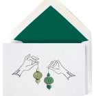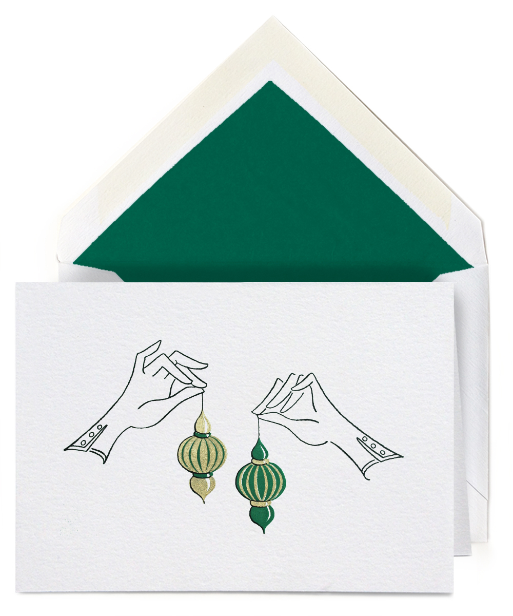 Pick just the right one with the Choosing an Ornament Card from our Holiday collection.The design is hand-engraved in steel and stamped in black, holiday green, and gold ink on heavy archival stock, the envelopes are lined in holiday green tissue.