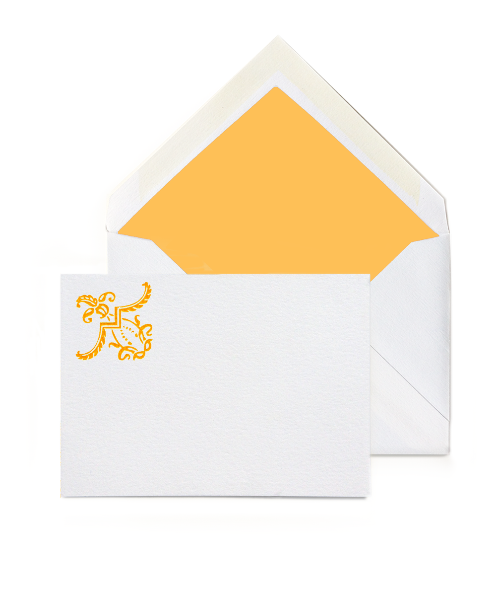 Heavy archival stock Escort Cards with the Arabesque motif, Goldenrod edge stains and matching tissue-lined envelopes. Our centennial sized flat cards can be used as escort or seating cards for weddings, dinners, holiday parties, corporate events, office parties, and more. The Arabesque motif is printed in Goldenrod Ink with genuine engraving.