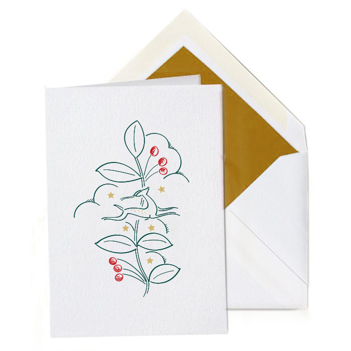 Email us mail@thornwillow.com if you would like to have a custom greeting engraved inside the card and your address stamped on the envelope flap (minimum order 50 cards and envelopes = 5 boxes).