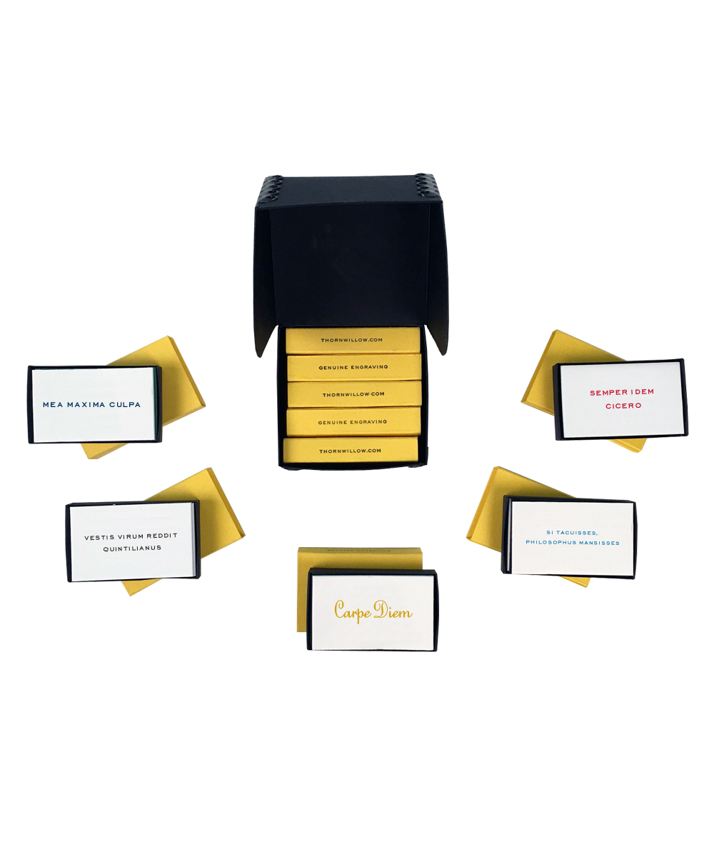Matchbox Collector’s Packs are made with engraved Identity Cards in packs of 5. They serve as excellent party favors, gift enclosures, and conversation starters. All packs have a random assortment of quotes following each pack’s specific theme. Our Matchbox collection includes Motivational Quotes, Love Quotes, Latin Quotes, French Quotes, Thank You cards, and the Party Pack, with more unique themes to come.