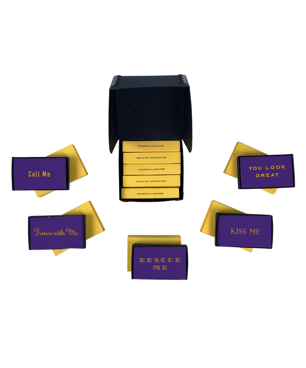 Matchbox Collector’s Packs are made with engraved Identity Cards in packs of 5. They serve as excellent party favors, gift enclosures, and conversation starters. All packs have a random assortment of quotes following each pack’s specific theme. Our Matchbox collection includes Motivational Quotes, Love Quotes, Latin Quotes, French Quotes, Thank You cards, and the Party Pack, with more unique themes to come.