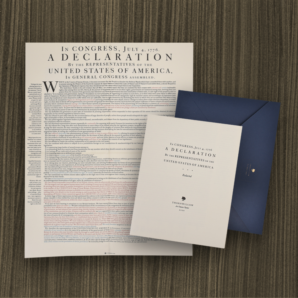 Printed letterpress in 3 colors, the Redacted Declaration Broadside beautifully reproduces our most important founding document, both celebrating its noble goals and unflinchingly exposing its inconsistencies and faults. Changing colors and marginal notes reflect centuries of change, from a damning rebuke of slavery (cut from Jefferson’s earlier draft), to the gradually expanding meaning of “All Men”, to the struggles for equal treatment which continue today. We have come a long way in the last 244 years, and though we believe the Declaration still serves as a roadmap to a worthy destination, we know we still have a long way to go to achieve its lofty ideals.