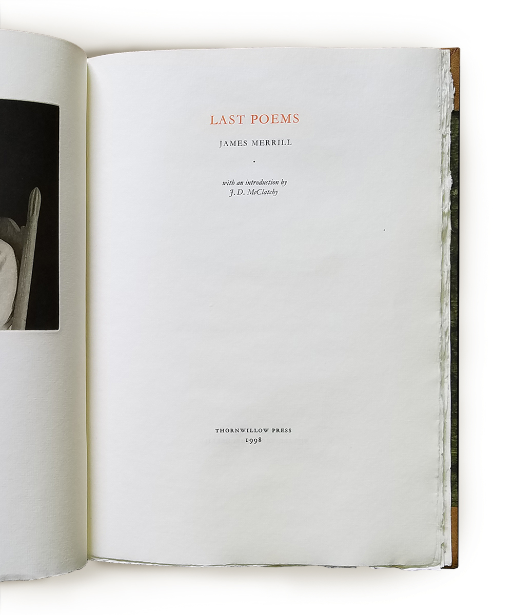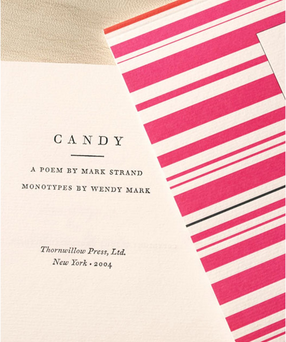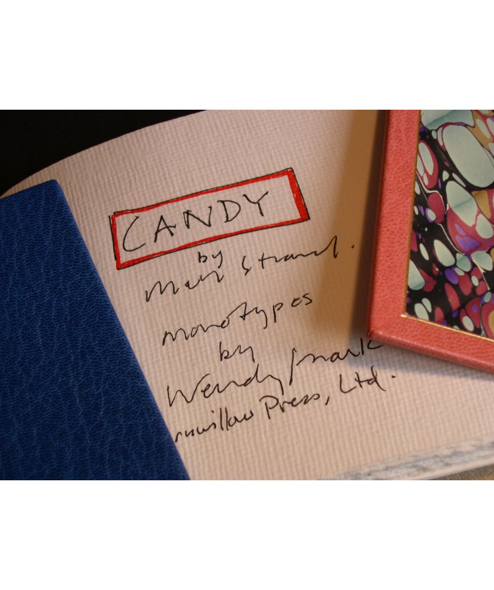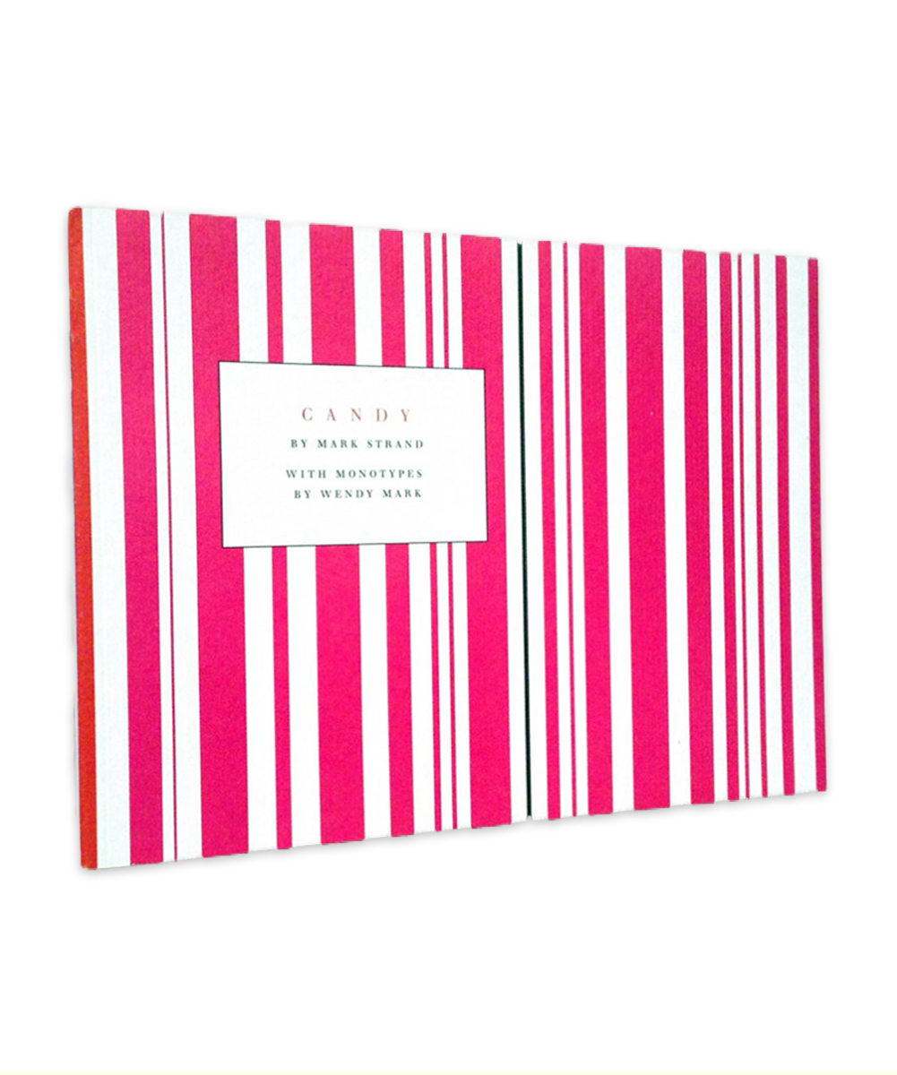 This whimsical and beautiful poem by former U.S. Poet Laureate Mark Strand celebrates the many virtues, joys, and challenges of candy. This facsimile edition of Candy: a Poem by Mark Strand, 2004, is letterpress printed from the hand-written manuscript. The monotypes by Wendy Mark were made especially for this edition and were reproduced from her originals using offset lithography. Each copy is individually numbered and signed by both the poet and the artist.