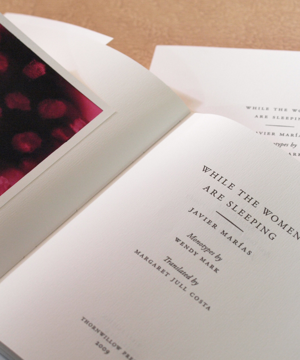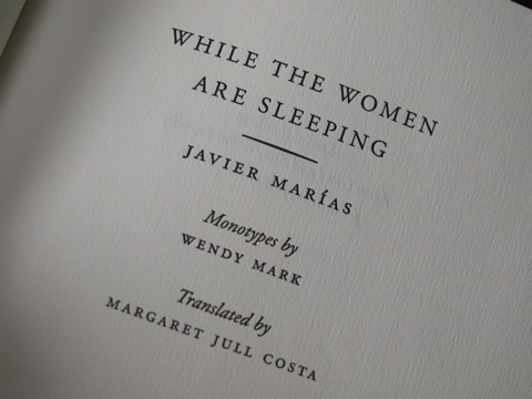 Javier Marías’s imperfect characters are memorable, dividing humanity into those who can look at themselves and speak with sheer, frightening honesty and, more commonly, those who would rather view themselves through the protection of a straw hat. Translated by Margaret Jull Costa, this first English-language edition of While the Women Are Sleeping (which was reprinted in the November 2009 New Yorker) is printed letterpress and includes six archival pigment prints of original monoprints by Wendy Mark. The monotypes chronicle the atmosphere of the story, from the sun-kissed beach to the dark confessions that conclude the characters’ summer getaway.